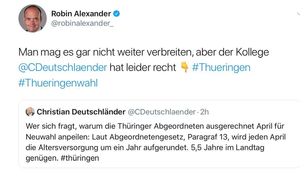 Die Union dagegen rauscht in den Umfragen Richtung zehn Prozent ab, seit sie gemeinsam mit AfD und FDP den Kurzzeit-Ministerpräsidenten Thomas Kemmerich gegen alle politische Vernunft ins Amt gehievt hat. Bei raschen Neuwahlen drohten Thüringens einstiger Staatspartei herbe Verluste. Abgeordnete müssten dann um ihre Mandate bangen - und manche gar um ihre Pensionsansprüche.